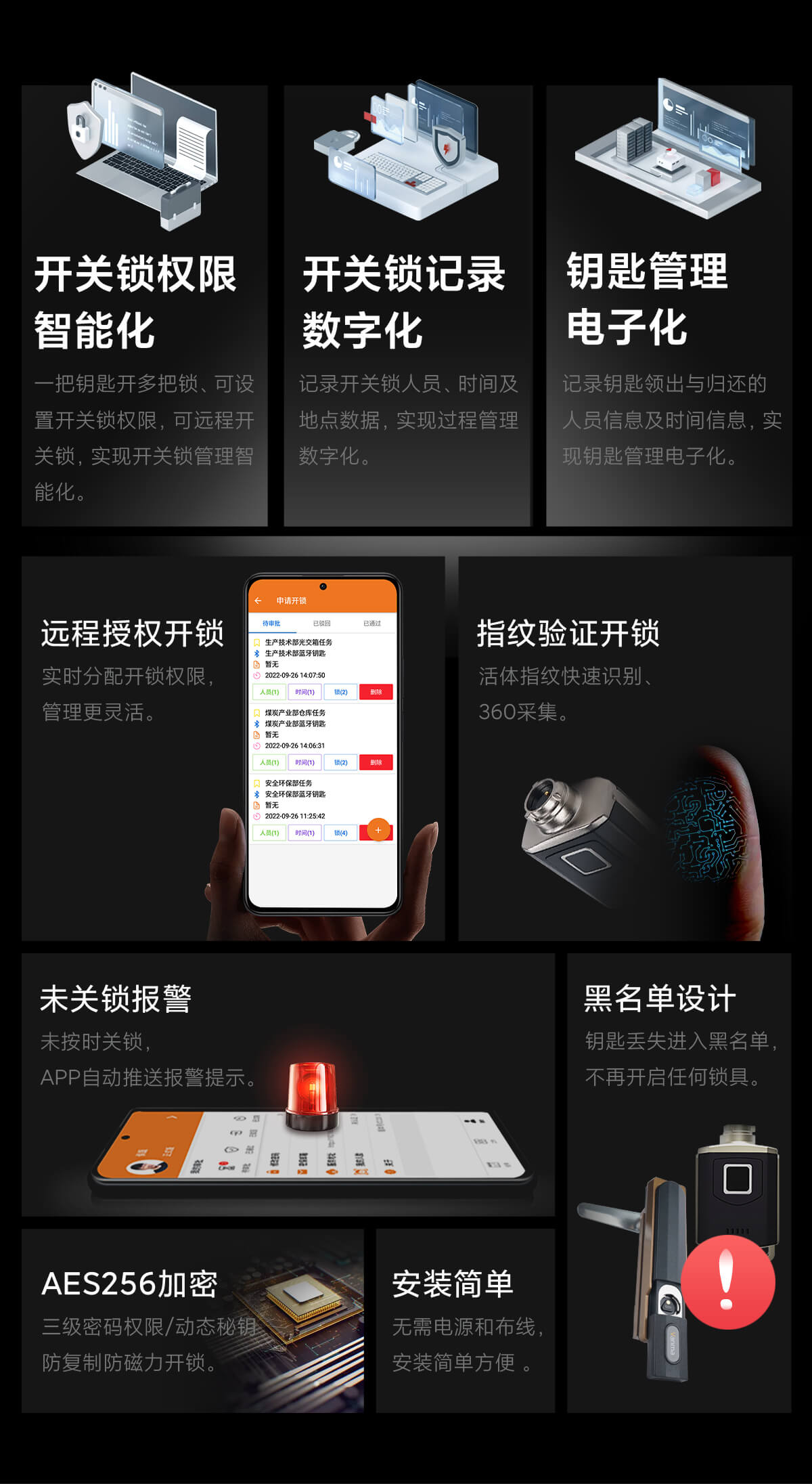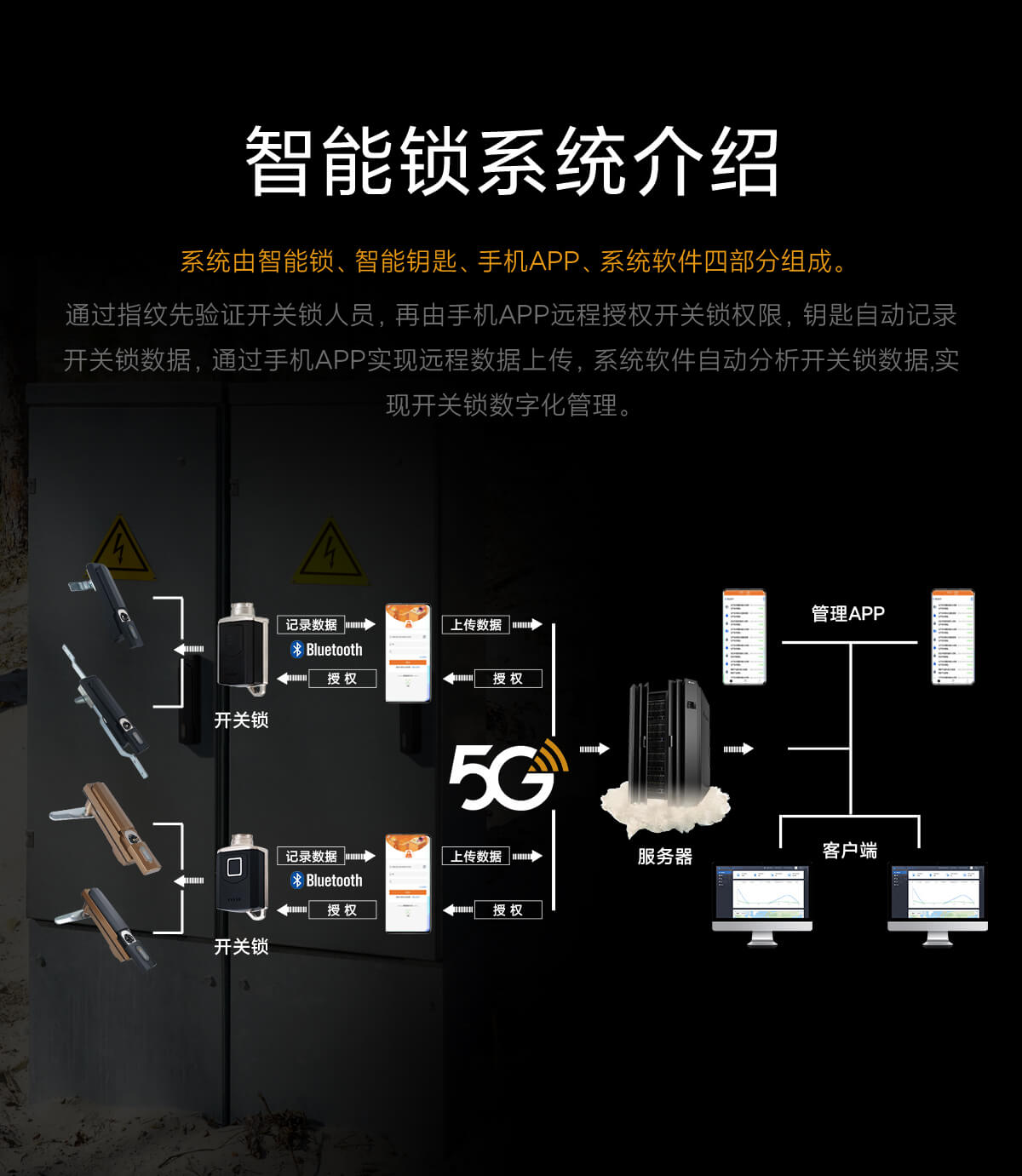 通過指紋先驗證開關(guān)鎖人員,再由手機APP遠程授權(quán)開關(guān)鎖權(quán)限,鑰匙自動記錄開關(guān)鎖數(shù)據(jù),通過手機APP實現(xiàn)遠程數(shù)據(jù)上傳,系統(tǒng)軟件自動分析開關(guān)鎖數(shù)據(jù)。實現(xiàn)開關(guān)鎖數(shù)字化管理