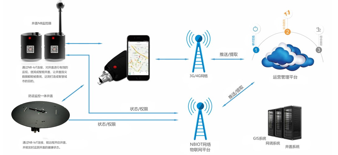智能井蓋擁有唯一的RFID身份標識,采用NBIOT網絡將信息采集統一監(jiān)控,結合專利技術的物聯鎖,實現城市井蓋資源的監(jiān)控防盜可視化。