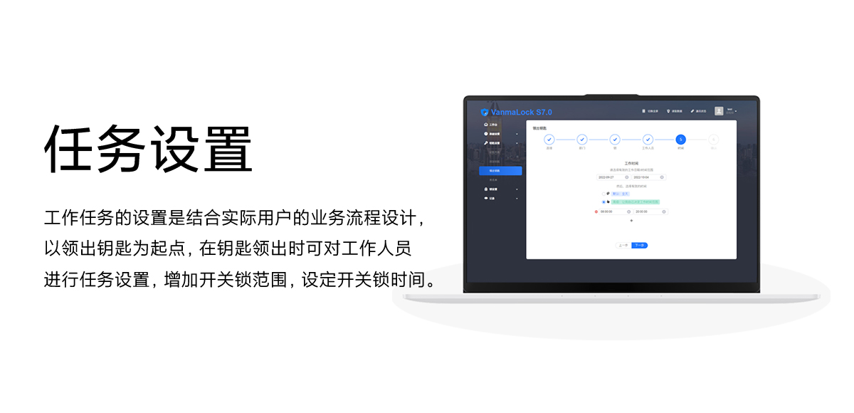 工作任務(wù)的設(shè)置是結(jié)合實(shí)際用戶的業(yè)務(wù)流程設(shè)計(jì),以領(lǐng)出鑰匙為起點(diǎn),在鑰匙領(lǐng)出時(shí)可對(duì)工作人員進(jìn)行任務(wù)設(shè)置,增加開(kāi)關(guān)鎖范圍,設(shè)定開(kāi)關(guān)鎖時(shí)間。