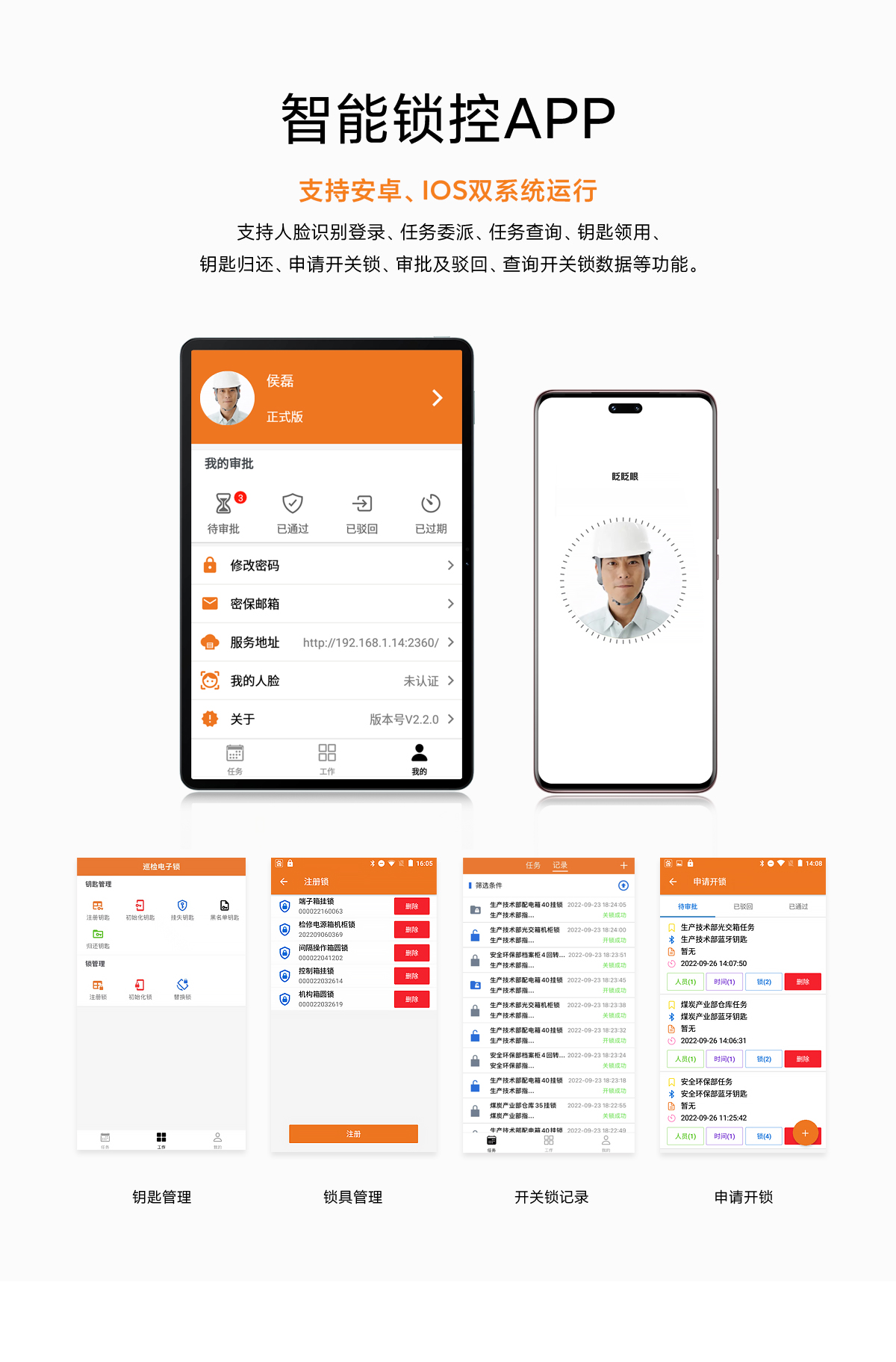 支持人臉識(shí)別登錄、任務(wù)委派、任務(wù)查詢、鑰匙領(lǐng)用、鑰匙歸還、