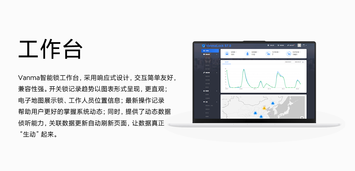 Vanma智能鎖工作臺(tái),采用響應(yīng)式設(shè)計(jì),交互簡(jiǎn)單友好,兼容性強(qiáng)。開(kāi)關(guān)鎖記錄趨勢(shì)以圖表形式呈現(xiàn),更直觀;電子地圖展示鎖、工作人員位置信息;最新操作記錄幫助用戶更好的掌握系統(tǒng)動(dòng)態(tài);同時(shí),提供了動(dòng)態(tài)數(shù)據(jù)偵聽(tīng)能力,關(guān)聯(lián)數(shù)據(jù)更新自動(dòng)刷新頁(yè)面,讓數(shù)據(jù)真正”生動(dòng)“起來(lái)。