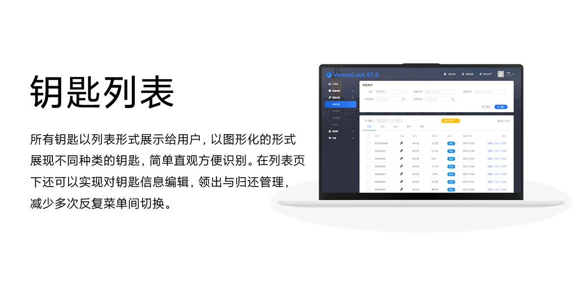 所有鑰匙以列表形式展現(xiàn)給用戶,以圖形化的形式展現(xiàn)不同種類(lèi)的鑰匙,簡(jiǎn)單直觀方便識(shí)別。在列表頁(yè)下還可以實(shí)現(xiàn)對(duì)鑰匙信息編輯,領(lǐng)出與歸還管理,減少多次反復(fù)菜單間切換。
