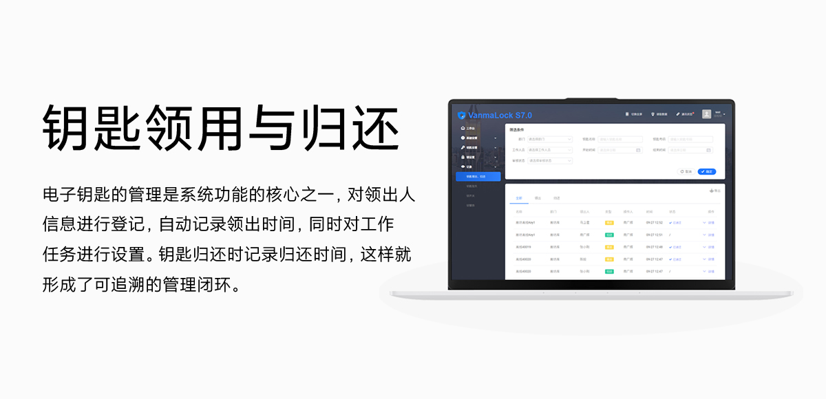 電子鑰匙的管理是系統(tǒng)功能的核心之一,對(duì)領(lǐng)出人信息進(jìn)行登記,自動(dòng)記錄領(lǐng)出時(shí)間,同時(shí)對(duì)工作任務(wù)進(jìn)行設(shè)置 。鑰匙歸還時(shí)記錄歸還時(shí)間,這樣就形成了可追溯的管理閉環(huán)。