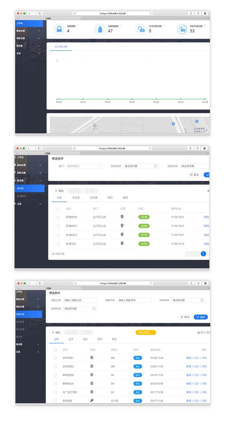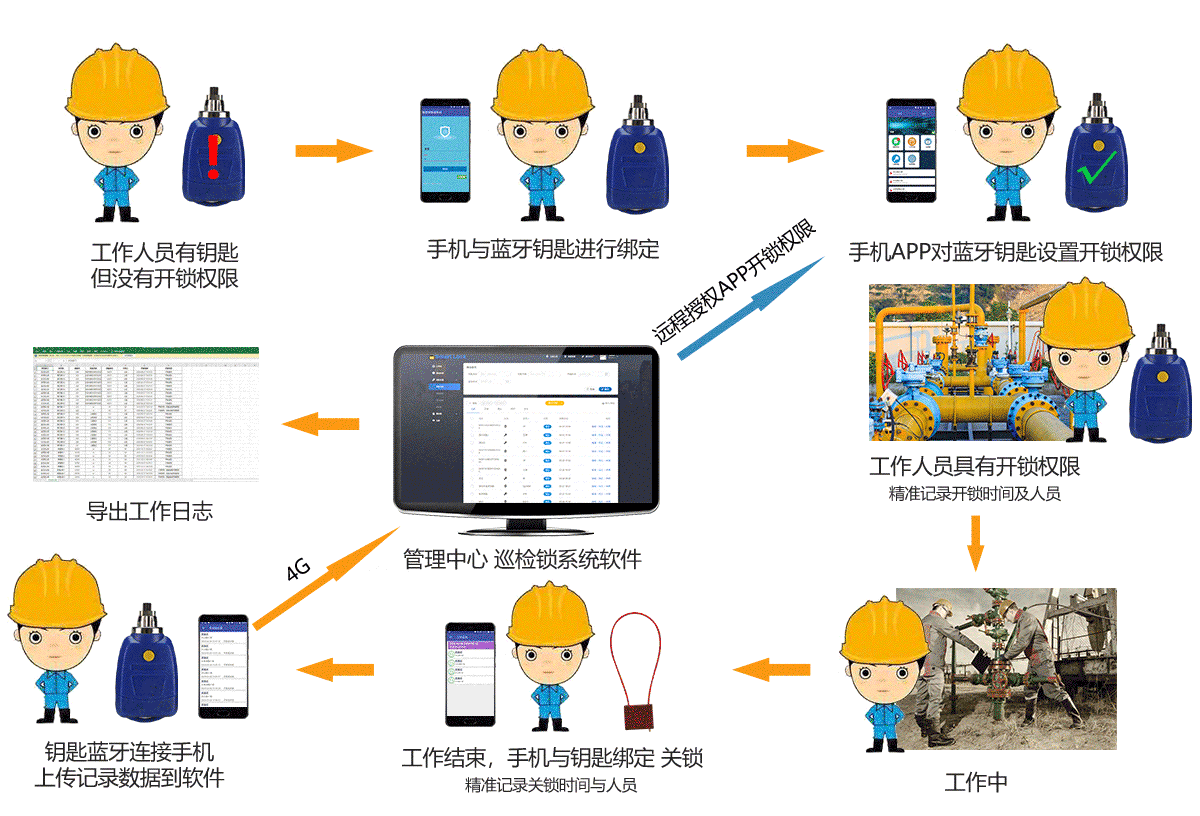 開鎖同時,鑰匙內會記錄巡檢員的身份及開鎖時間,并且開鎖有權限要求。管理者只需要通過系統(tǒng)來指定開鎖人,只有通過系統(tǒng)授權,巡檢員才能成功開啟無源鎖,否則鎖具無法被打開。智能鑰匙不僅可以記錄人員信息、時間信息,還可以實現(xiàn)一把鑰匙通開所有鎖,利用開關鎖時間記錄,解決了燃氣閥門,設備箱等重點檢查位置的時效管理。