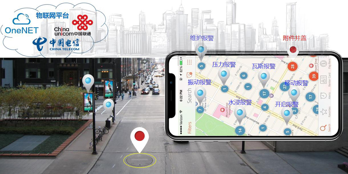 智能井蓋擁有唯一的RFID身份標識,采用NBIOT網(wǎng)絡(luò)將信息采集統(tǒng)一監(jiān)控,結(jié)合專利技術(shù)的物聯(lián)鎖,實現(xiàn)城市井蓋資源的監(jiān)控防盜可視化。